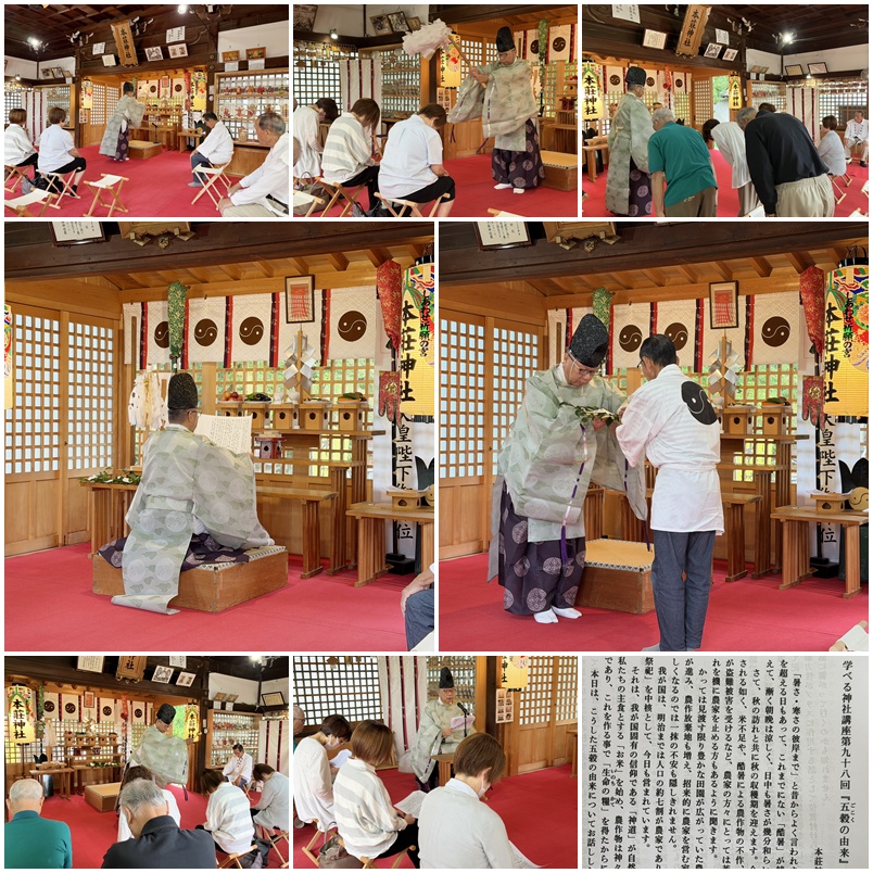 去る令和7年10月4日(土)午前10時から本莊神社御拝殿にて10月の月次祭を斎行しました。氏子総代、保存会、敬神婦人会と一般参拝の方々を交え、例月通り月次祭が斎行されました。月次祭後は、宮司による「学べる神社講座第98回」が行われました。今月のお題は、「五穀の由来」でした。